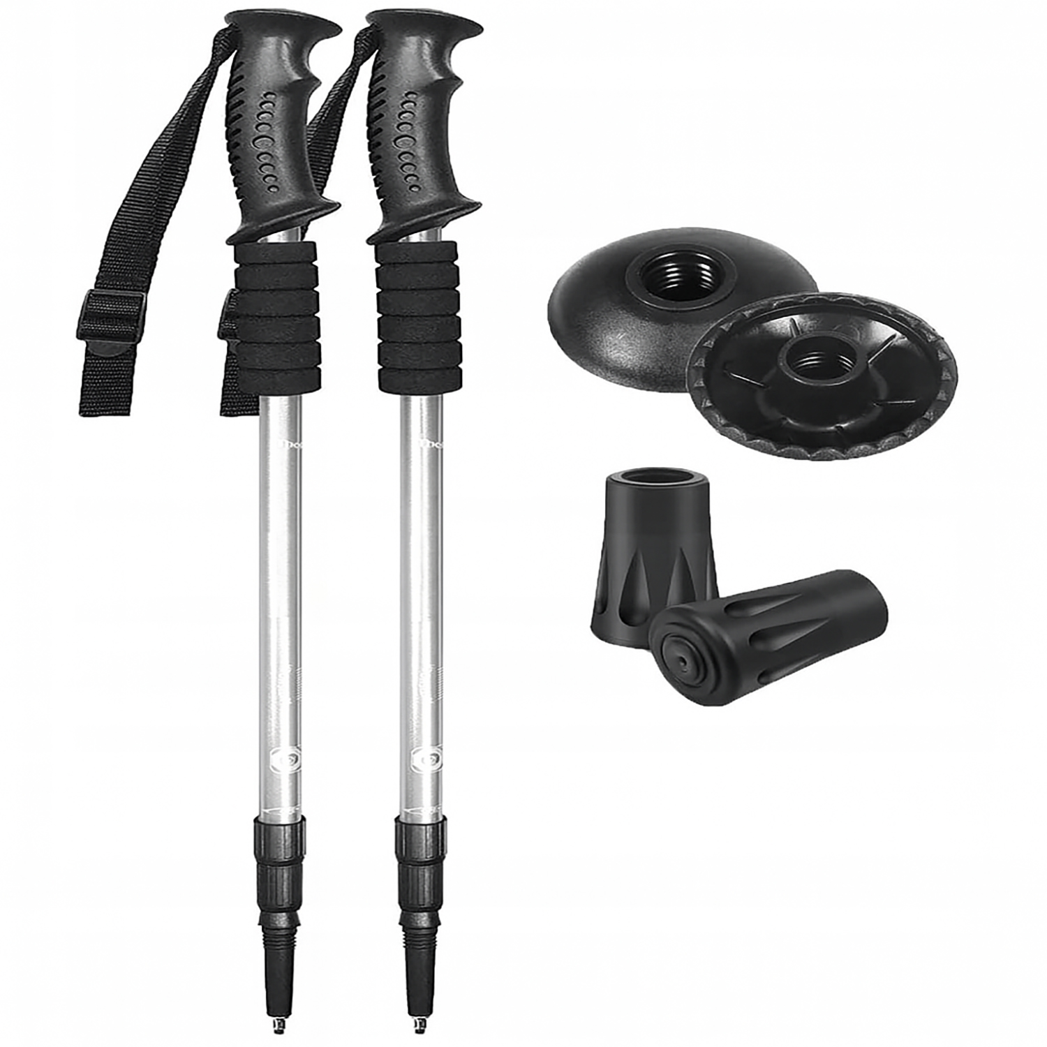 Wymienne nakładki oraz talerzyki umożliwiają korzystanie z kijów podczas wędrówki po wszystkich nawierzchniach. Idealnie sprawdzą się podczas wędrówek po asfalcie, trawie, śniegu, lodzie, piasku czy błocie. Talerzyki znajdujące się w zestawie pomocne są podczas wędrówek po śniegu. Dzięki nim kijki nie zapadają się w śniegu. Nakładki wykonane są z gumy o niskiej ścieralności, dlatego mogą być stosowane przez długi czas.